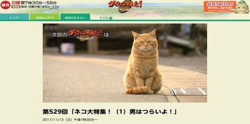 “2週連続でネコの大特集!飼いネコ最大の疑問が突然の失踪。そこで、“猫の島”で研究者とともに1匹の若オスに密着.すると旅に出なければならないオスの宿命が明らかに!” 「ダーウィンが来た 生き物新伝説」第529回「ネコ大特集!(1)男はつらいよ!2017/…