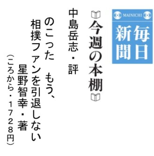 今週の本棚 中島岳志・評 『のこった もう,相撲ファンを引退しない』=星野智幸・著 (ころから・1728円) のこった |ころからの本|赤羽の小さな出版社 ころから 毎日新聞2017年12月3日 東京朝刊 https://mainichi.jp/articles/20171203/ddm/015/070/…