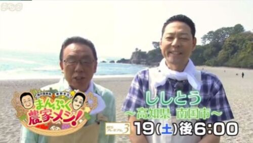 「さあ,『まんぷく農家メシ!』始まりました. 梅沢さん.今回は高知県高知市にやって来ました. 桂浜でオープニングでございます.どういうイメージですか?高知県のイメージ.桂浜のイメージ?」 「高知っていうと,やっぱりカツオ.有名です」 「けれど…