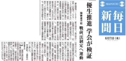 旧優生保護法 優生推進,学会が検証 障害者不妊 戦前,法制定へ運動 毎日新聞2018年6月7日 東京朝刊 優生保護法(1948~96年)の前身で,ナチス・ドイツの断種法をモデルにした国民優生法(40~48年)の法制化を積極的に進めた日本民族衛生学会(…