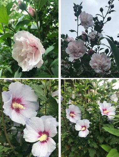 梅雨時の花,アジサイは最盛期を過ぎ,--- 次は夏の花. 我が家で夏の花と言えばムクゲ(木槿,槿).日本古来よりある夏の花の代表種の一つですね. 既に三分-四分咲きというところでしょうか. 二株あるうち,八重花は,かなり評判がいいようです. ムクゲ…
