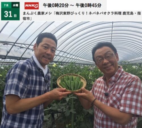 「さあはじまりました.まんぷく農家メシ!でございます」「はい」 「今回は,鹿児島県の指宿にやって来ております」「あら」 「今回はですね.鹿児島指宿オクラ料理,オクラでございます」「ネバネバは体にいいって言いますからね」 「夏野菜ですよね」「夏…