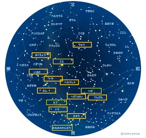 夏の代表的な星座の一つにして,私が知っている数少ない星座の一つ. はくちょう座. 5月の午前2時,6月の午前0時,7月の午後10時,8月の午後8時,頃見える星座 https://www.study-style.com/seiza/summer.html 「天の川にそって大きな翼を広げた白鳥…