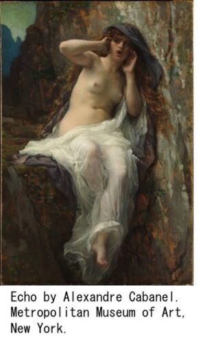 echo/ēchṓ(山びこなどを含めた”反響”)を擬人化した山のニンフ(ニムフ,ニュンペー,ニュムペ) エコー(エコ,エーコー). Echo (mythology) - Wikipedia 牧神パーンとの逸話も残されていますが, http://yachikusakusaki.hatenablog.com/entry/2019/11/…