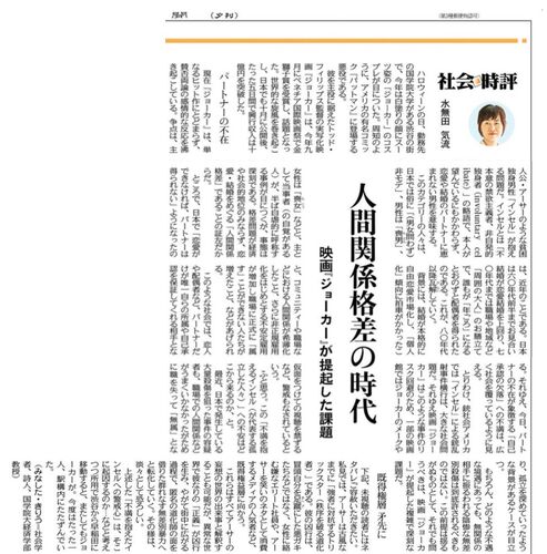 社会時評 水無田気流 人間関係格差の時代 映画『ジョーカー』が提起した課題 東京新聞2019年11月26日(火曜日)夕刊 ハロウィーンの日,勤務先の国学院大学がある渋谷の街で,今年は白塗りの顔にスーツ姿の『ジョーカー』のコスプレが目についた.周知のよう…