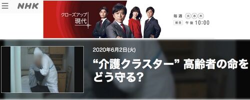 介護施設での新型コロナ感染クラスターが大きな問題となっています. 6月2日のNHK総合クローズアップ現代「“介護クラスター” 高齢者の命をどう守る?」は,その現状と今後の課題を伝える好番組でした. 番組のダイジェストがネット上に公開されています(“介…
