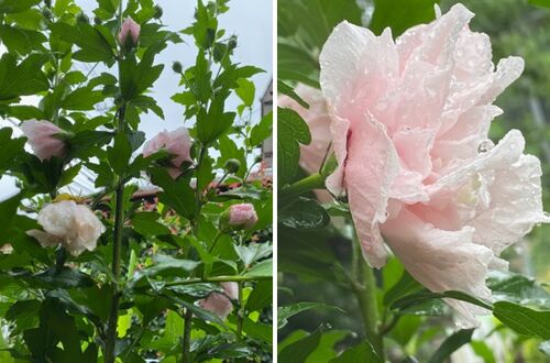 昨日の雨の中, 八重のムクゲが一斉に花を開き始めました. 一足先に咲き始めていた一重の方も,更に沢山の花をつけています. 青空が似合うムクゲですが---- 雨をうけた花にも風情がありますね. 雨はれて 心すがしく なりにけり 窓より見ゆる 白木槿(しろ…