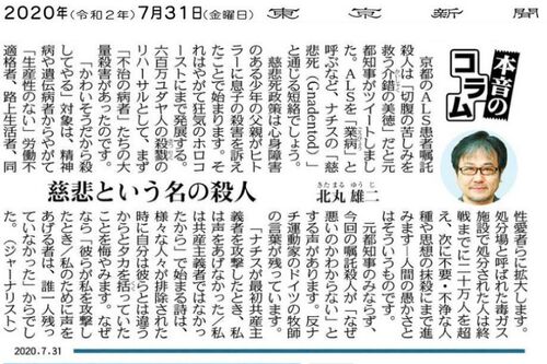 慈悲という名の殺人 北丸雄二 東京新聞 本音のコラム 2020年7月31日 京都のALS患者嘱託殺人は「切腹の苦しみを救う介錯(かいしゃく)の美徳」だと元都知事がツイートしました. ALSを「業病(ごうびょう)」と呼ぶなど,ナチスの「慈悲死(Guadentod)」と…