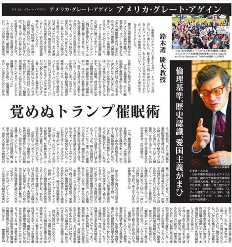 アメリカ・グレート・アゲイン 覚めぬトランプ催眠術 倫理基準,歴史認識,愛国主義がまひ 鈴木透・慶大教授 毎日新聞2020年11月25日 東京夕刊 特集ワイド https://mainichi.jp/articles/20201125/dde/012/030/014000c 「催眠術にかかっていますからね」. …