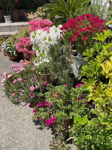 4月,5月には,ご近所を散策するだけで,家々の玄関先や垣根を飾る沢山の花々を楽しむことができます. こちらのお宅では.紅白のツツジ,マーガレット,ヨモギギクなどの鉢が,寄せ植えのように集められて,見事. シバザクラ.そして,まだ育てたことが…
