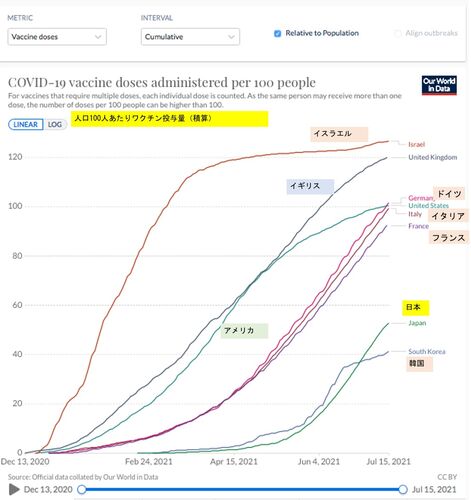 下のグラフは,人口100人あたりのワクチン接種回数です. 縦軸200が全国民が二回の接種を受けたことを表しています. 先行して接種を開始した,イスラエル,そしてイギリス・アメリカのワクチン接種は,100人あたり100〜120回でその速度が鈍り,さらなる接種…