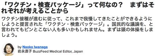ワクチン接種が進むに従って、これまで我慢してきたことができるようにしようと提言された「ワクチン・検査パッケージ」. ワクチン・検査パッケージの動向は|薬事日報ウェブサイト https://www.cas.go.jp/jp/seisaku/ful/taisakusuisin/bunkakai/dai7/vacc…