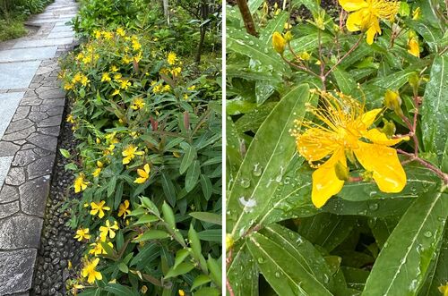 鎌倉おんめ様(大巧寺)の八幡宮通りに面した門を入ったすぐ右手に,美しい黄花が咲いています. 初めは,キンシバイ(金糸梅)だと思っていたところ---名札をみると ビヨウヤナギ 小径をはさんで左手にキンシバイが植えられていて,花を比べてみると(下画…