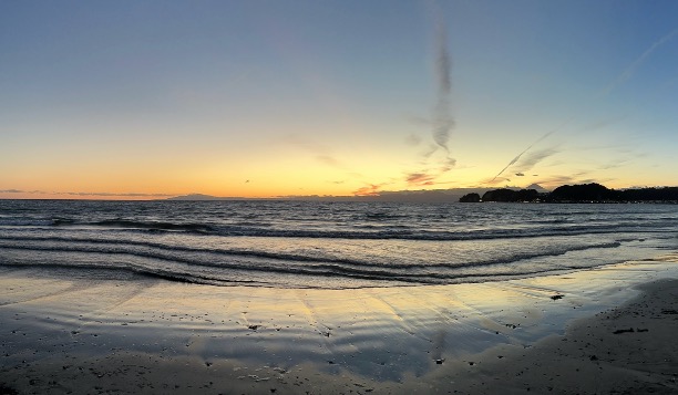 材木座の浜に降りれば風紋と白波を越え富士輝けり